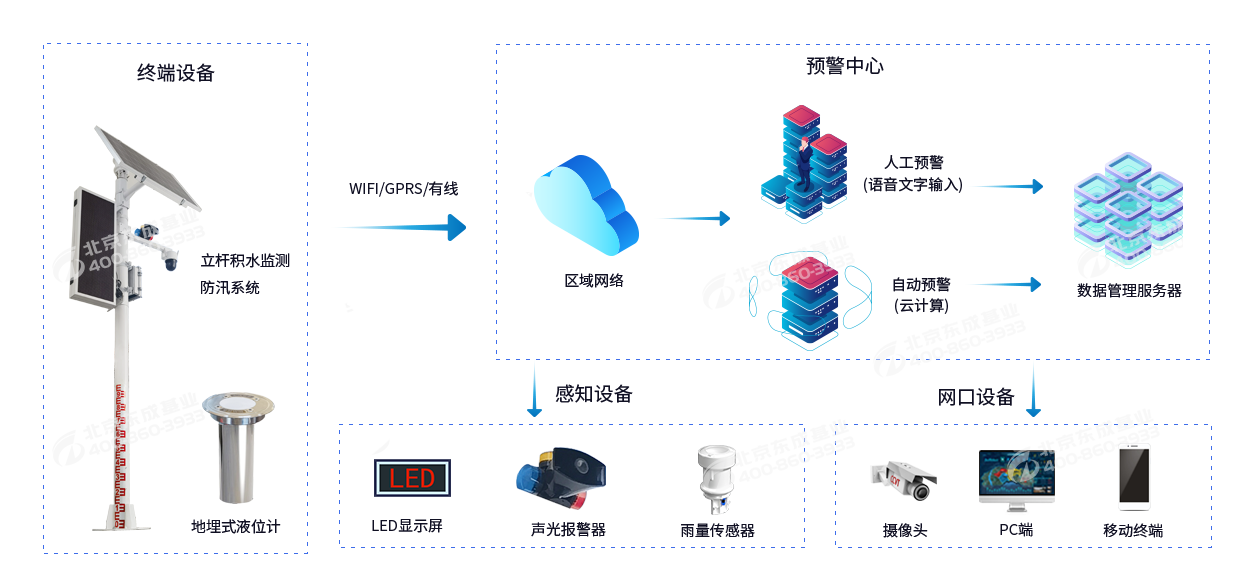 無需安裝地埋式液位計,通過立式燈桿上的水尺便可直觀觀測積水數據,可因地制宜選擇4G(全網通)、網口等上傳方式。
